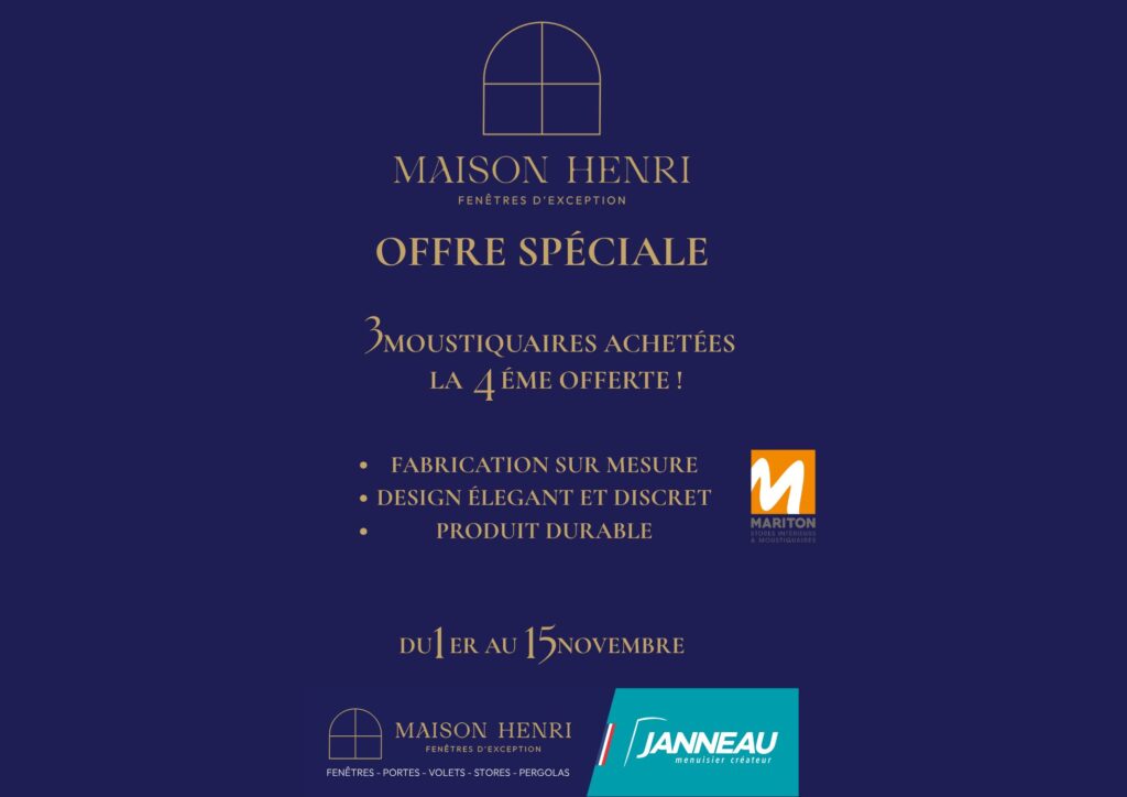 Pour un intérieur sain et un confort optimal, Maison Henri vous propose une offre exceptionnelle : 3 moustiquaires achetées la 4 ème offerte.